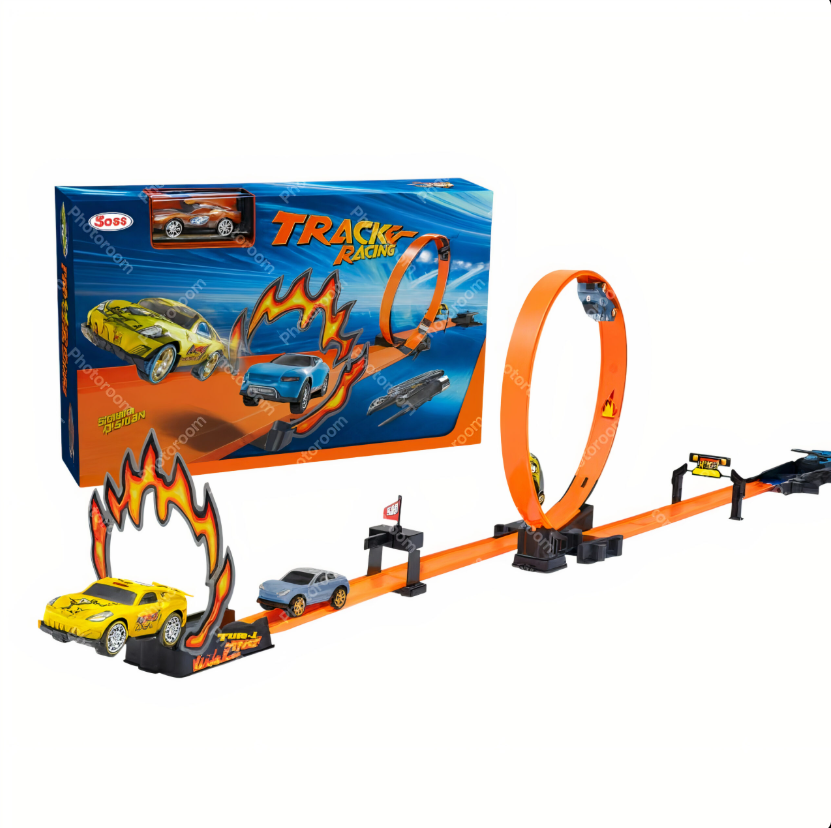 Piesa centrală a circuitului este cercul de 360°, care permite mașinuței să facă o rotație completă în aer, testând gravitația și dovedind cât de spectaculoase pot fi cursele la scară mică. Această caracteristică atrage imediat atenția copiilor și le oferă o experiență apropiată de cascadoriile reale, pe care le văd în desene sau jocuri video. Alături de acest element spectaculos, inelul de foc adaugă un plus de emoție și dramatism, transformând fiecare cursă într-o adevărată aventură de viteză și curaj.