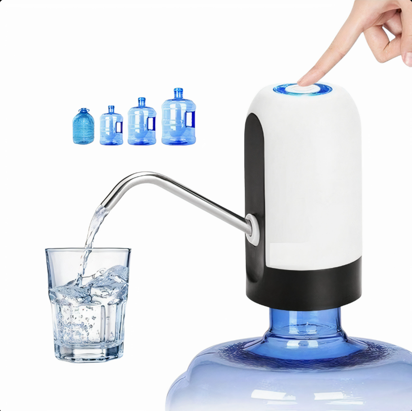 Pompa electrică funcționează cu o atingere a unui singur buton, permițând umplerea paharului sau a sticlei în câteva secunde, fără efort sau stropire. Este ideală pentru copii, vârstnici sau persoane care nu doresc să ridice bidoane grele.